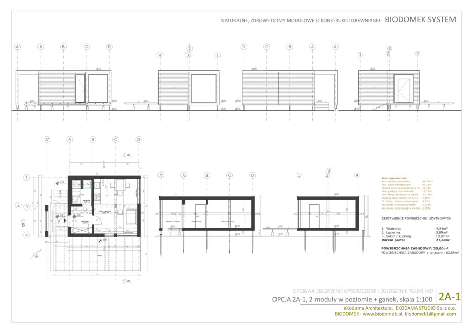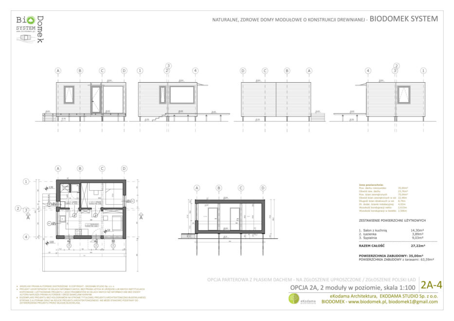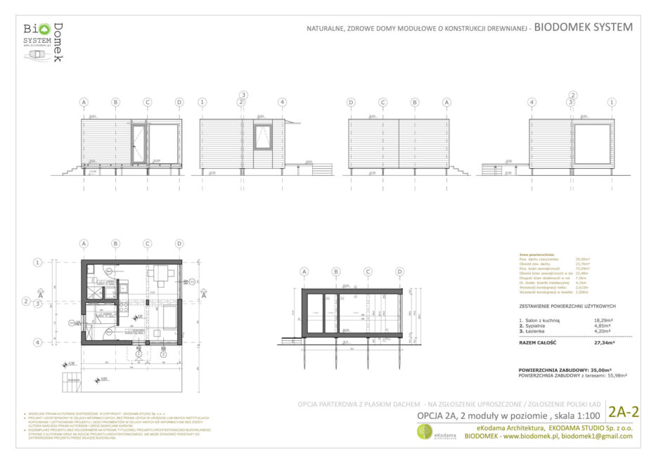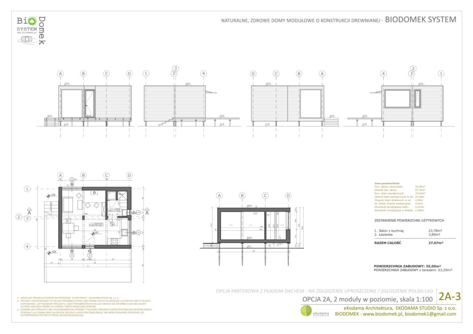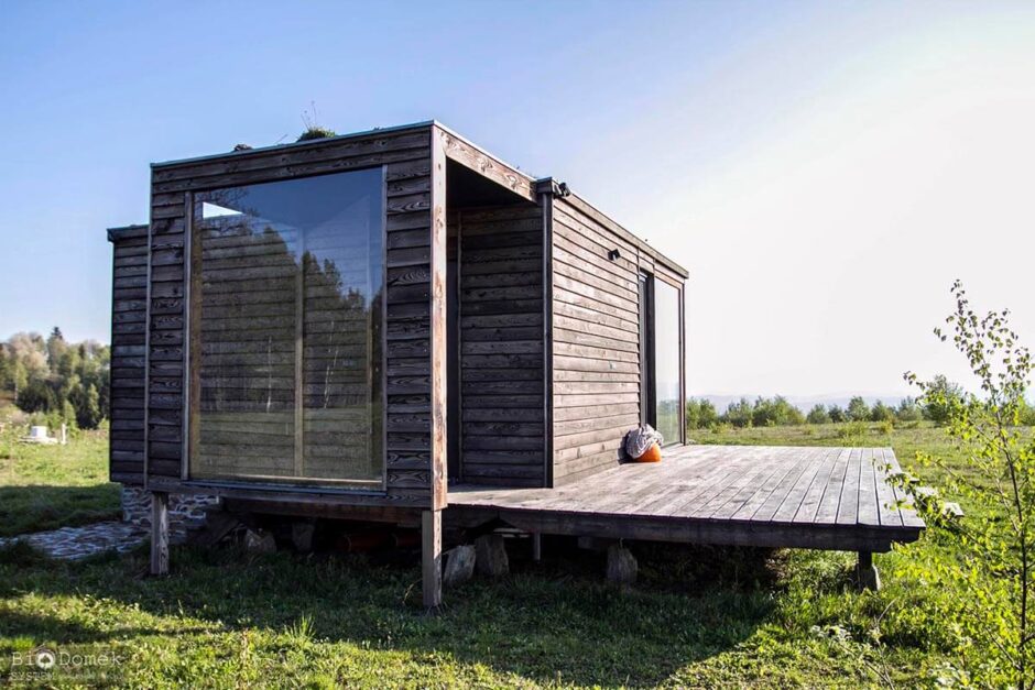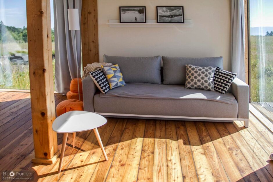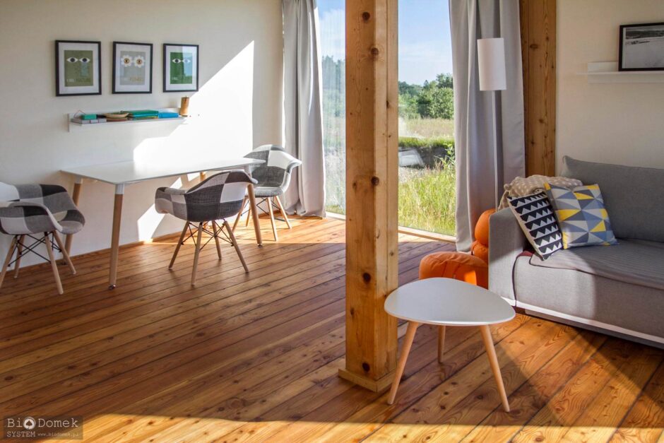 Biodomek 2A ist das ideale Starterhaus für eine Einzelperson oder ein Paar. Obwohl es kein allzu großes Haus ist, ist es aufgrund der durchdachten Gestaltung sehr geräumig. Es verfügt über einen Wohnbereich mit Küche und Essbereich im Studio-Stil, ein Badezimmer und eine Eingangshalle mit ausreichend Stauraum. Denken Sie daran, dass es immer erweiterbar ist.